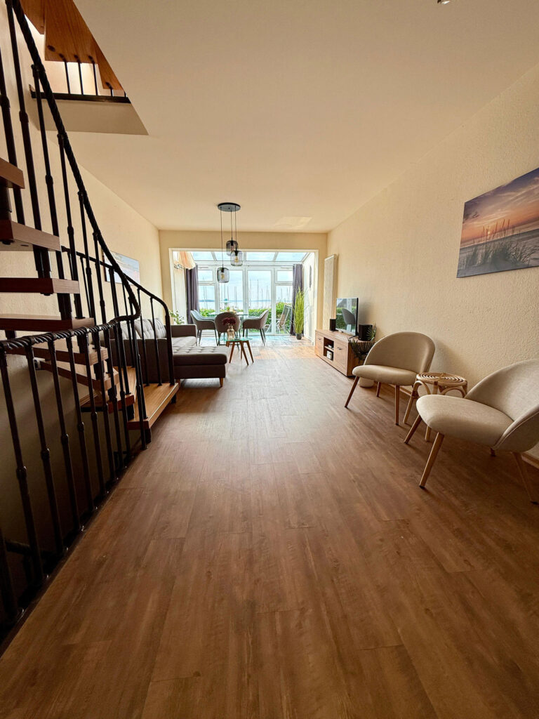 Die halboffene Küche ist bestens ausgestattet und lädt zum gemeinsamen Kochen ein. Im Obergeschoss erwartet Sie ein charmantes Schlafzimmer mit Doppelbett, ein offenes Galeriezimmer mit komfortablem Schlafsofa und Zugang zum Balkon. Das Dachgeschoss bietet ein weiteres Schlafzimmer mit zwei Einzelbetten, Arbeitsplatz mit Wasserblick und Smart-TV – ideal für Kinder, Jugendliche oder kreative Rückzugsmomente.